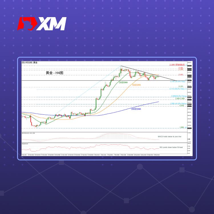 金价在3月8日反弹至历史新高2,195后 ,H4图显示价格形成看跌三角形。目前正在进行看跌回调,技术震荡指标显示势头疲软 。异同移动平均线(MACD)在零线下方区间震荡,而相对强弱指数(RSI)则在50中立水平下方疲软。